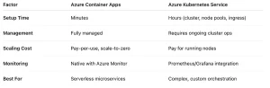 For most FinTech SaaS platforms targeting 99.9% uptime, ACA delivers reliable HA without cluster complexity. While AKS is ideal for teams chasing 99.99%+ uptime with region-specific failover requirements.